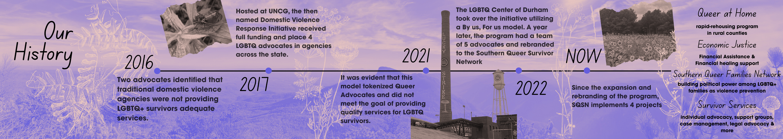 Over 5 years of implementation, it became clear that this violence prevention and response work was most effective when it was done by queer communities for queer communities. The project moved from UNCG to the LGBTQ Center of Durham. With this shift, we began to focus on providing direct services to queer and trans survivors across the entire state of NC and rebranded the project the Southern Queer Survivor Network. We are grateful to our queer and trans siblings who came before us in the anti-violence movement and made our work possible.